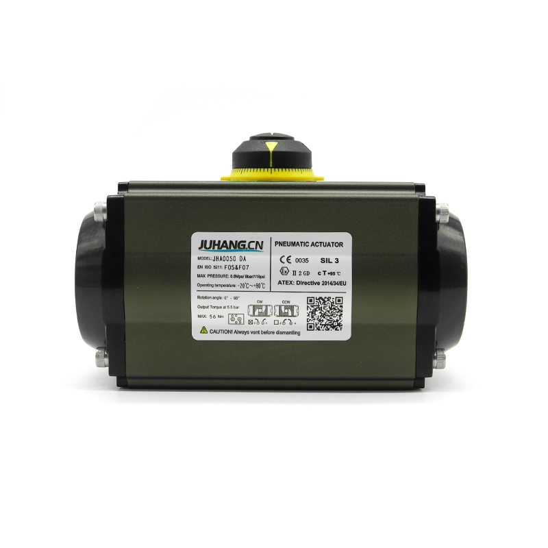 Dvojni delovni aktuator stojala in pinion JHA0050da poganja stisnjen zrak, ki ga poganja ravno gibanje batnega stojala, da se prenaša prestavni prenos izhodne gredi in izhodi z kotnim potekom pnevmatskega aktuatorja. Široko se uporablja v krogličnem ventilu, metuljskem ventilu, vtičnem ventilu in drugem kotnem potezu ventila in nastavitve, ki ga lahko uporabimo tudi za druge vrtljive priložnosti, je idealna naprava za doseganje industrijskega nadzora avtomatizacije cevovodov.